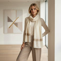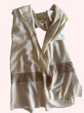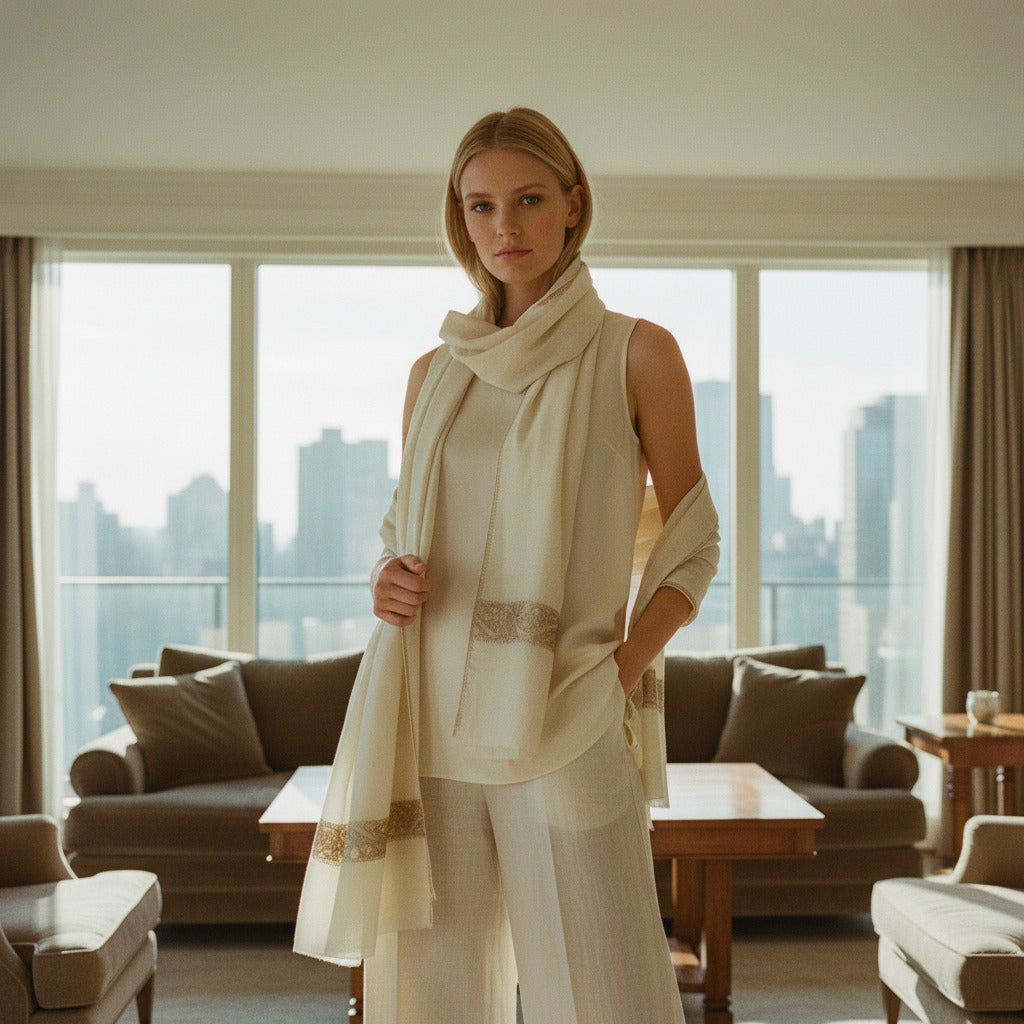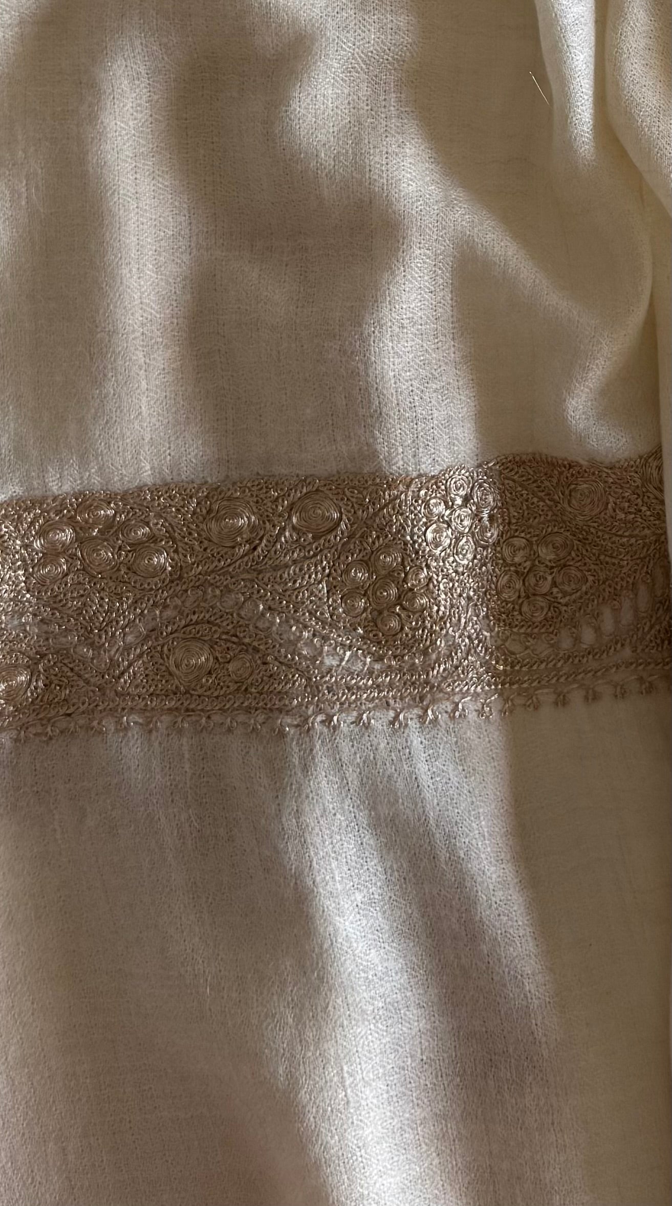 Hüllen Sie sich in zeitlose Eleganz mit unserer Éclat d'Argent Pashmina, einem Meisterwerk traditioneller Handwerkskunst aus dem Herzen des Himalayas. Diese luxuriöse Pashmina ist vollständig handgewebt und -gefertigt und mit aufwendiger Echtsilberstickerei verziert, die ihrer natürlich weichen Textur einen subtilen Glanz verleiht.
