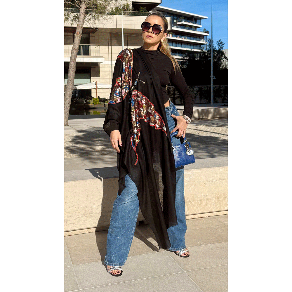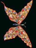Un somptueux motif de papillon, brodé de fils de soie colorés dans des nuances de rouge, de bleu, d’or et de brun, se déploie sur une base noire profonde — symbole de transformation, de liberté et de grâce.